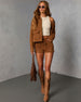 Autumn called, she wants her main character moment back, and the Autumn Muse Suede Jacket is exactly how you get it. With its rich suede texture and no-stretch structure, this layer means serious fall fashion business while still giving effortlessly cool. The collared neckline, front flap pockets, and buttoned cuffs bring utility energy to a soft, boho-femme vibe. Pair it with the matching Autumn Muse Lace Up Suede Shorts (sold separately) for a head-to-toe look.