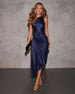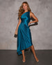 Look chic at your next formal gathering with the Modern Day Glam Satin Pleated One Shoulder Cutout Asymmetrical Maxi Dress. Its pleated design and asymmetrical hem make such a bold statement!
