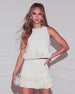 A dreamy mix of polish and playful detail the Moonbeam Tweed Mini Skirt comes into play. With luxe tweed woven with subtle metallic threading, this skirt brings just the right amount of sparkle to your look. The overlapping chiffon circle hem adds a soft, whimsical twist, while the partial elastic waistband keeps things comfy from ceremony to after-party. Pair it with the matching Moonbeam Tweed Sleeveless Top for a picture-perfect set.
