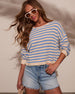 Perfect for a light breeze, the Sidelines Cotton Striped Knit Pullover in taupe and black stripes features a wide neckline.