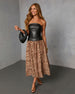 When your outfit says “icon” before you even speak, you’re probably wearing the Thora Print Leather Corset Maxi Dress. Equal parts edgy and elegant, this head-turning piece pairs a sleek leather corset bodice with a flowy crepe skirt in a wild-but-polished leopard print. The rigid, non-stretch fabric means structure where you want it, and the relaxed skirt lets you move like you own the room, which, let's be honest, you do.